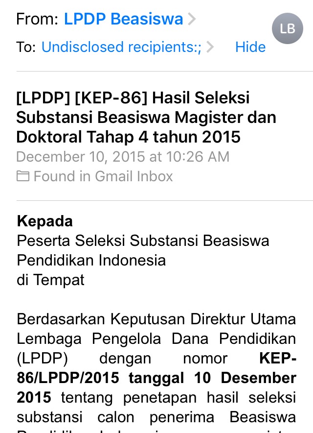 Email yang saya tunggu-tunggu hampir dua bulan, sampe juga. It was from LPDP. Dengan perasaan dag dig dug, saya akhirnya membuka email tersebut ....